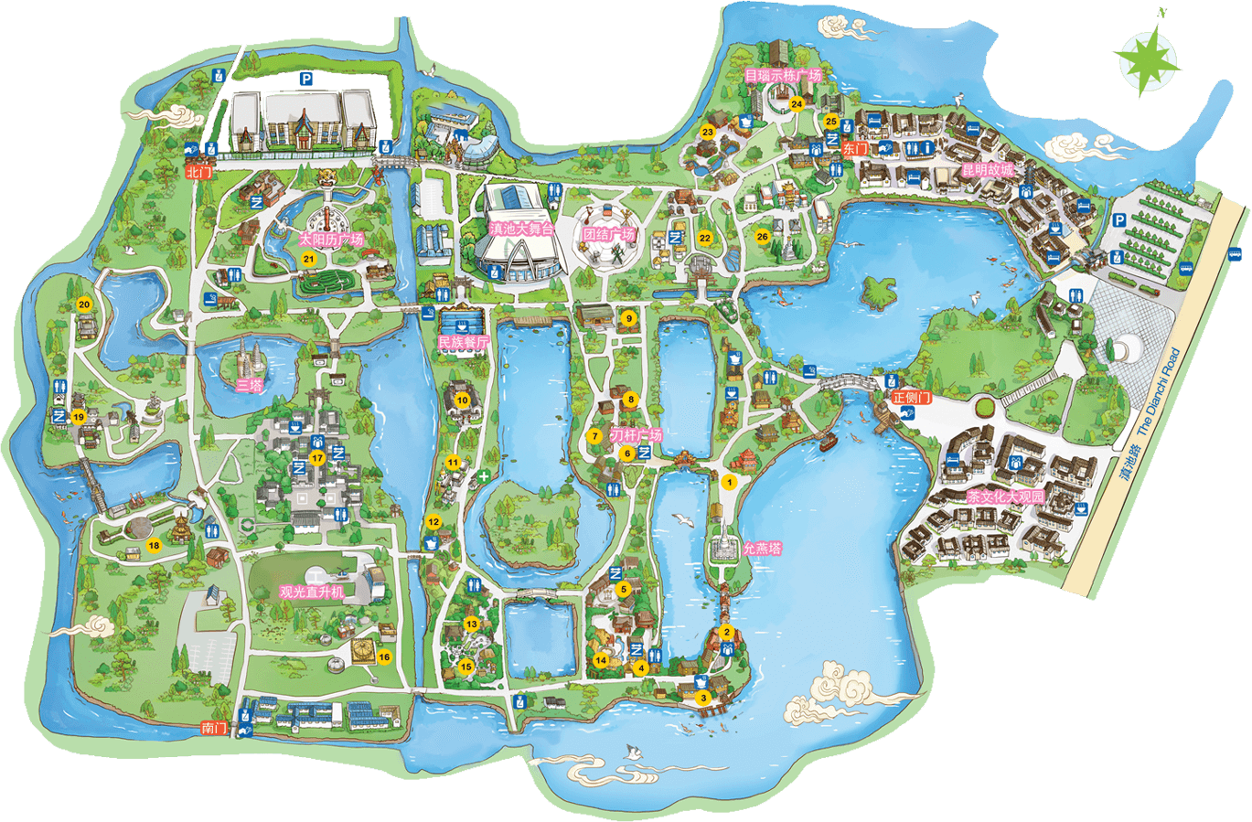 彝族在云南境內約471萬人,是省內人口最多、分布最廣的少數民族,主要聚居在金沙江、元江流域和哀牢山、無量山腹地。彝族是一個能歌善舞的民族,民間打歌、跳樂之風盛行,大三弦、跌腳舞久負盛名。火把節(jié)是彝族最具特色的民族節(jié)日。彝族村占地50余畝,三虎浮雕墻與虎頭內祖師形象表現(xiàn)了彝族虎鷹文化。太陽歷廣場圖騰柱上有太陽、虎、火和八卦圖形象,周圍環(huán)繞著10個朝向不同的月球造型,外圓周有12生肖石雕。依山而建的“...