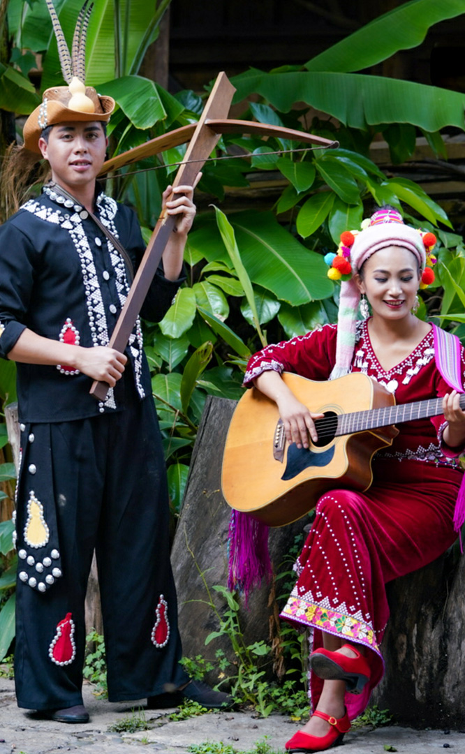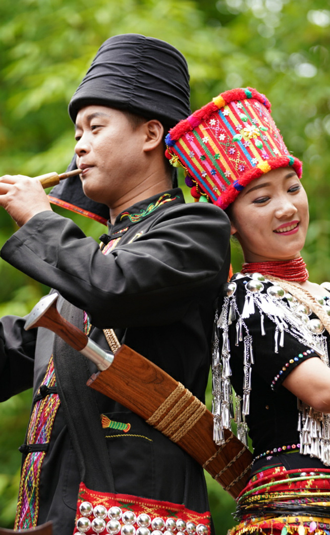 德昂族人口約1.7萬,主要分布在德宏州和保山市的潞西、梁河、瑞麗、隴川、隆陽等縣區(qū)。民居多為草排覆頂竹木結構的干欄式建筑,眼前的德昂村建筑納入了能容納數十人居住的德昂大房子,氈帽頂的小房子,還有頗具浪漫色彩的大公房、小公房……還建有“龍陽塔”標志及佛教奘房、佛塔。德昂族民間普遍信奉南傳佛教,民俗活動與佛事活動關聯(lián)緊密。潑水節(jié)、開門節(jié)、關門節(jié)是重大節(jié)日。德昂族服飾色彩豐富,口頭文學特別是民歌創(chuàng)作活動...